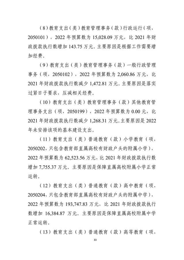 教育支出(类)普通教育(款)高中教育(项,2050204,只包含教育部直属高校有财政户头的附属中学),2022年预算数为 193,747.83 万元,比2021年财政拨款执行数增加 16,384.87 万元。