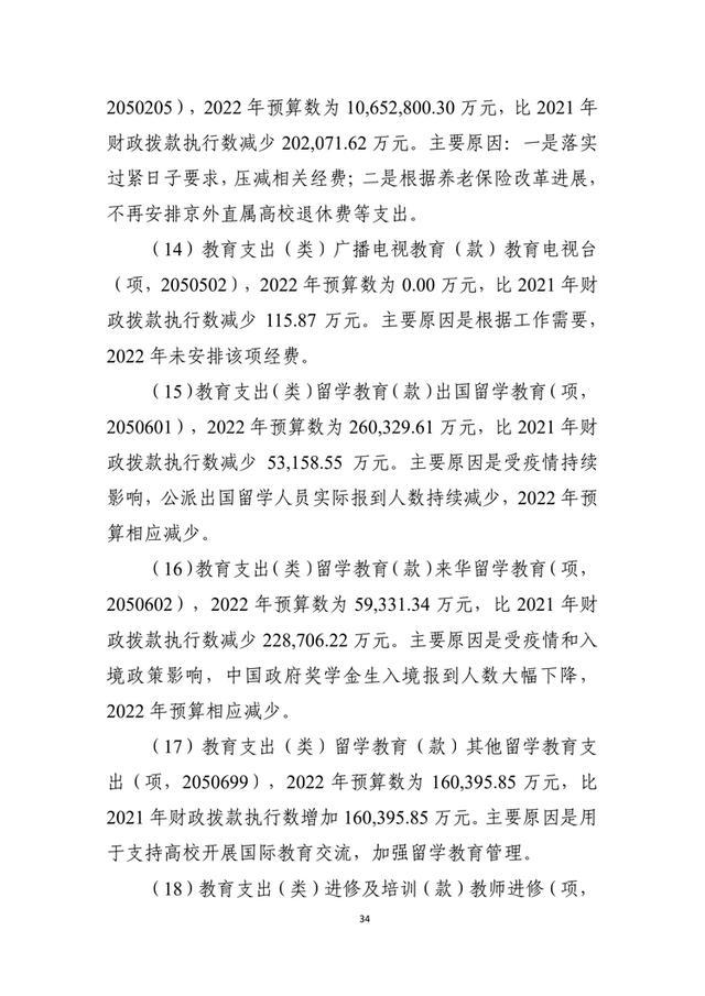 教育支出(类)普通教育(款)高等教育(项,342050205),2022年预算数为 10,652,800.30 万元,比2021年财政拨款执行数减少 202,071.62 万元。