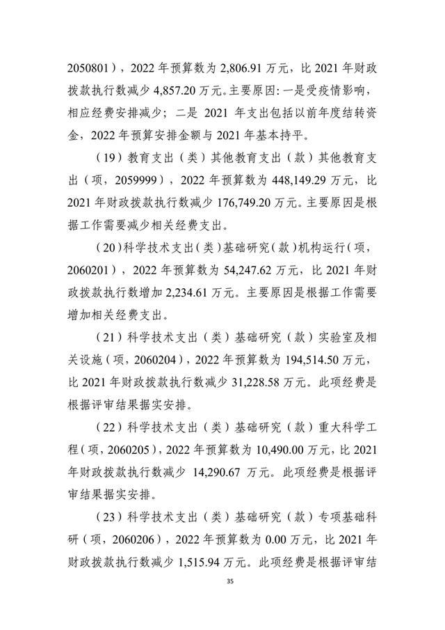 科学技术支出(类)基础研究(款)实验室及相关设施(项,2060204),2022年预算数为 194,514.50 万元,比2021年财政拨款执行数减少 31,228.58 万元。
