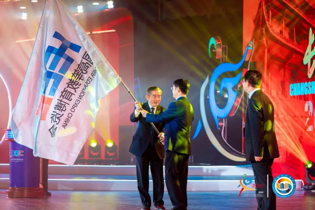 之后,湖南教育厅厅长蒋昌忠将高博会会旗交给中国高等教育学会会长,教育部原党组副书记、副部长杜玉波,杜玉波将会旗交给下一届展会举办地青岛方代表青岛市副市长朱培吉。这象征着“高博会”将从“星城”长沙移师“岛城”青岛。