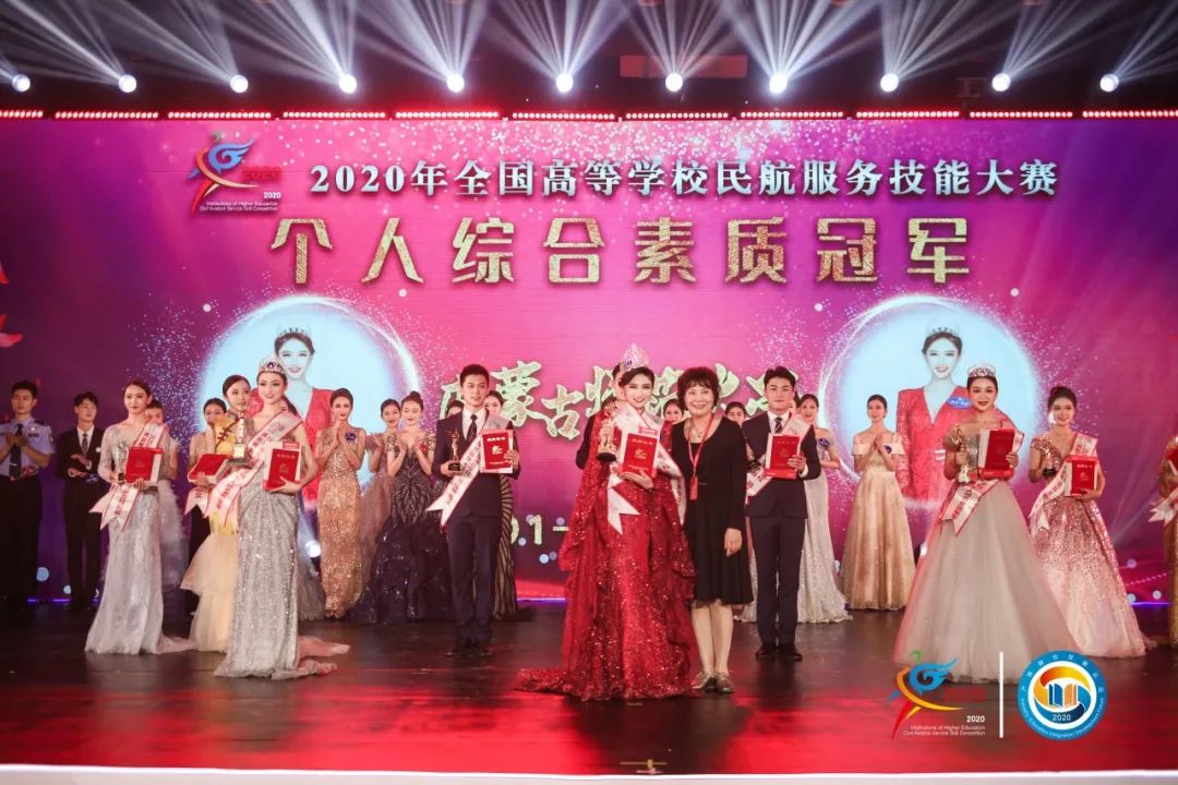民航局原团委书记、高校毕业生就业协会航空分会会长、2020年全国高等学校民航服务技能大赛组委会主任王小娟为个人综合素质冠军颁奖。