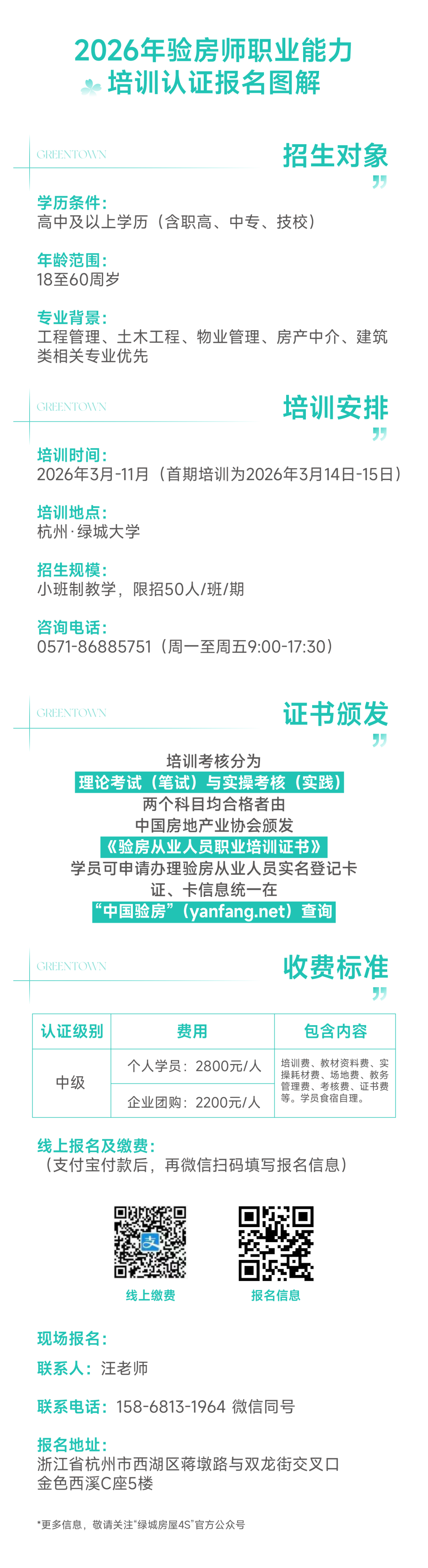 在“好房子”时代,验房师这一职业,正伴随市场的深度转型,从新兴走向规范,从幕后走向台前。如果你正在寻找一个能长期发展、且充满成就感的职业方向,验房师或许便是不错的选择。 2026年验房师职业能力培训招生正式启动。作为此次培训活动的承办方,绿城房屋4S公司自2017年创立以来,始终致力于开展房屋全生命周期服务,在提供专业验房服务的同时,更致力于赋能行业未来——将积累的实战经验,转化为可复制、可传播的系统知识,助力每一位有志者,迈向职业验房师的广阔天地。 2025年首期验房从业人员职业能力培训班丨学员合影 在验房领域,绿城房屋4S基于全国60余城、超3000个项目的深度服务实践,构建起涵盖12大系统、43项精细标准的验房服务体系,沉淀了海量的真实案例与解决方案库。 一名优秀的验房师,既需要严谨的理论框架,更离不开对真实复杂场景的精准判断。这些源自一线、经过反复验证的经验,是绿城房屋4S对“好房子”的深刻理解,更是投身于验房师职业化教育最坚实的底气。 <左滑查看更多 依托绿城近31年的品质基因与绿城房屋4S的市场经验,2025年,在中国房地产业协会指导下,行业首个“验房产教融合实训基地”企业试点于绿城大学落成,并由绿城房屋4S公司负责运营。 这标志着绿城房屋4S从“行业实践者”向“人才培养与标准共建者”的延伸。我们将验证自身有效的服务流程、技术方法、问题数据库,系统性地注入课程研发与实训环节,为行业培养既懂标准、更懂实战的新一代职业验房师。从基地挂牌、课程研发、内训落地,到如今,即将正式迎来对外招生的新阶段。 行业首个“验房产教融合实训基地”在绿城大学揭牌 (上下滑动查看 更多课程亮点)