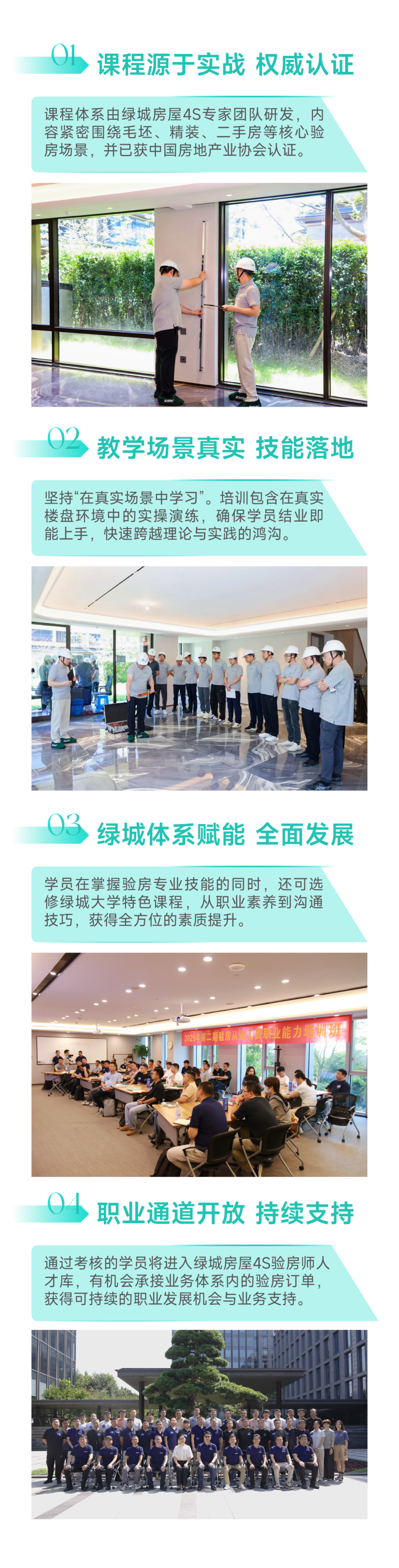 在“好房子”时代,验房师这一职业,正伴随市场的深度转型,从新兴走向规范,从幕后走向台前。如果你正在寻找一个能长期发展、且充满成就感的职业方向,验房师或许便是不错的选择。 2026年验房师职业能力培训招生正式启动。作为此次培训活动的承办方,绿城房屋4S公司自2017年创立以来,始终致力于开展房屋全生命周期服务,在提供专业验房服务的同时,更致力于赋能行业未来——将积累的实战经验,转化为可复制、可传播的系统知识,助力每一位有志者,迈向职业验房师的广阔天地。 2025年首期验房从业人员职业能力培训班丨学员合影 在验房领域,绿城房屋4S基于全国60余城、超3000个项目的深度服务实践,构建起涵盖12大系统、43项精细标准的验房服务体系,沉淀了海量的真实案例与解决方案库。 一名优秀的验房师,既需要严谨的理论框架,更离不开对真实复杂场景的精准判断。这些源自一线、经过反复验证的经验,是绿城房屋4S对“好房子”的深刻理解,更是投身于验房师职业化教育最坚实的底气。 <左滑查看更多 依托绿城近31年的品质基因与绿城房屋4S的市场经验,2025年,在中国房地产业协会指导下,行业首个“验房产教融合实训基地”企业试点于绿城大学落成,并由绿城房屋4S公司负责运营。 这标志着绿城房屋4S从“行业实践者”向“人才培养与标准共建者”的延伸。我们将验证自身有效的服务流程、技术方法、问题数据库,系统性地注入课程研发与实训环节,为行业培养既懂标准、更懂实战的新一代职业验房师。从基地挂牌、课程研发、内训落地,到如今,即将正式迎来对外招生的新阶段。 行业首个“验房产教融合实训基地”在绿城大学揭牌 (上下滑动查看 更多课程亮点)